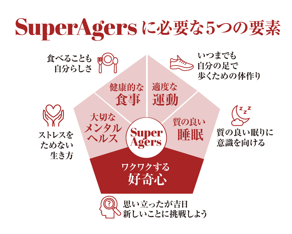 スーパーエイジャーとしての土台を作るため、5つの要素をテーマに、実践的な講座やイベントを提供します。