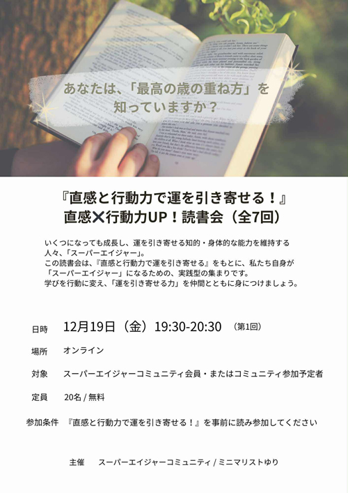 この読書会では、『直感と行動力で運を引き寄せる』の哲学を学び、私たち自身が「スーパーエイジャー」になるための、具体的な行動計画を立て・共有する実践型の集まりです。